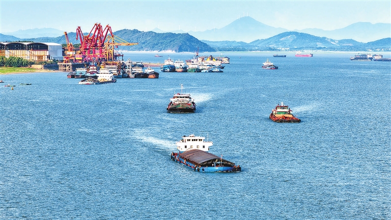 8月21日,庐山市,鄱阳湖上货运船舶往来穿梭,呈现一派繁忙景象。