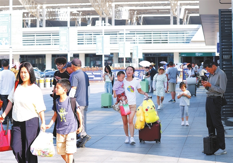 8月26日,随着暑期进入尾声,中小学校即将开学,九江火车站迎来暑运返程客流高峰。火车站广场上处处都是拖着行李箱赶车的人,在出站口,返乡“小候鸟”的身影随处可见。2025年铁路暑运自7月1日启动以来,探亲流、旅游流、学生流叠加,持续保持高位运行。 (本报记者 刘 家 摄)