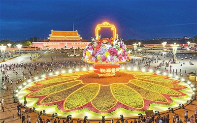 9月25日在天安门广场拍摄的“祝福祖国”大花篮夜景。