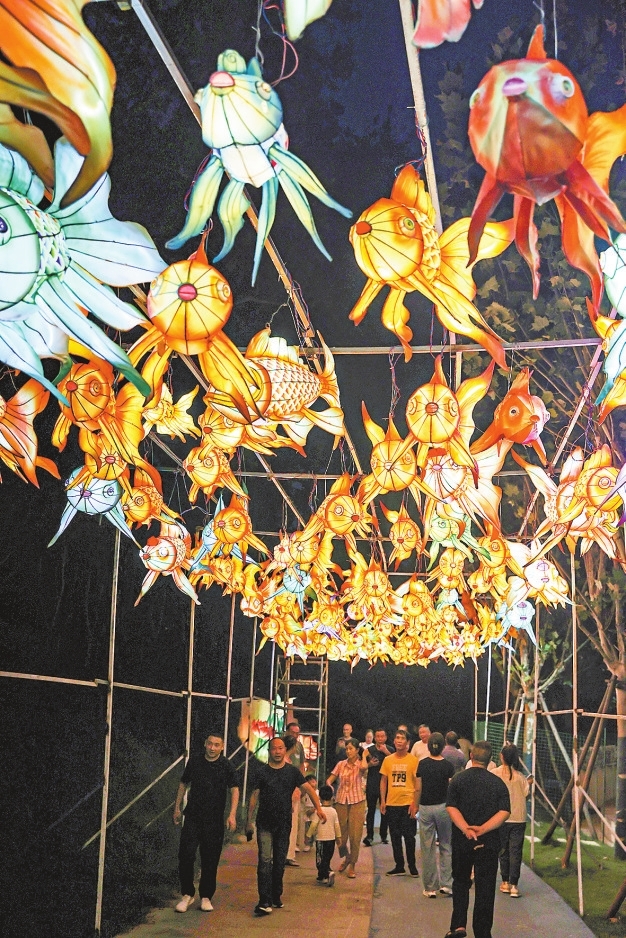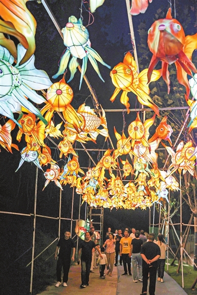 9月26日晚,甘棠公园内宛如光影流淌的梦幻之境,花开富贵、龙生九子等主题花灯璀璨亮相。
