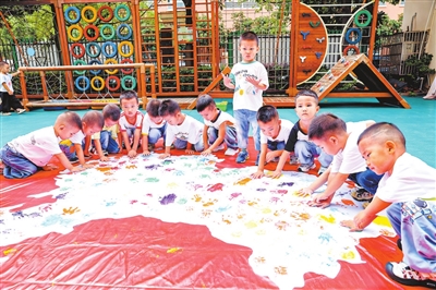 9月29日,浔阳区第一幼儿园组织开展“月圆映中秋 童心庆国庆”主题活动。在老师的带领下,孩子们学着绘制灯笼、描绘百米画卷、印制手掌画等,在欢乐中感受“双节”的喜庆氛围。 (本报记者 刘 家 摄)