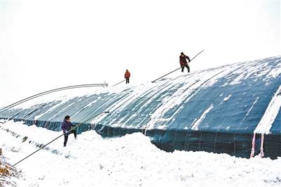 1月20日,河南省南阳市社旗县李店镇狮子庄村的农民在清理蔬菜大棚上的积雪。(新华社发 杨银鹏 摄)