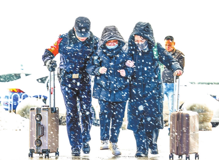 1月20日,在湖北省武汉站东广场,武汉铁路公安处武汉站派出所民警协助行动不便旅客进站。(新华社发 赵 军 摄)