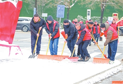 1月20日,志愿者在陕西省渭南市滨河大道清理路面积雪。(新华社发 崔正博 摄)