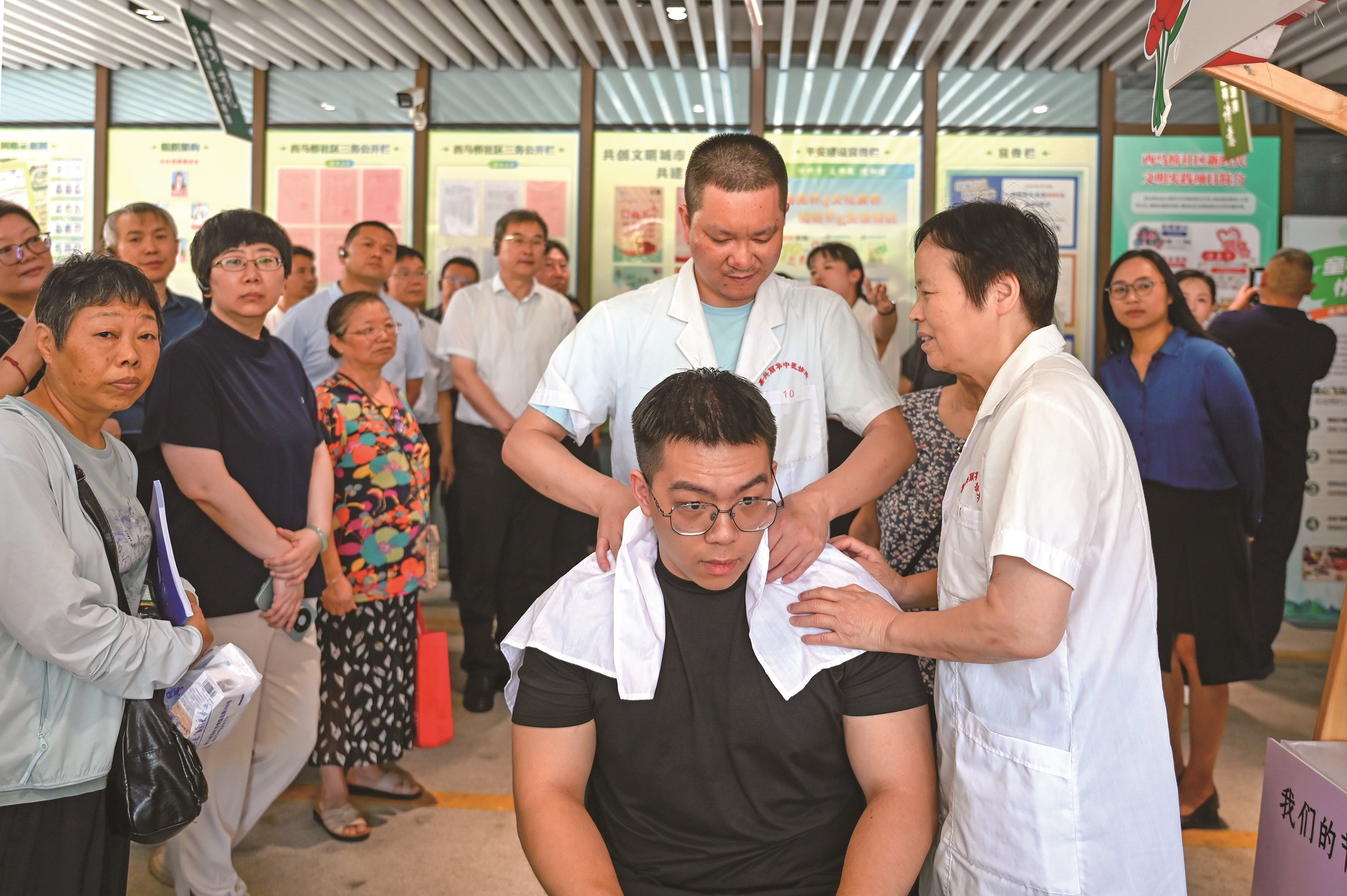 在观影的同时,现场还安排了便民服务。盲人中医师朱丽华正在为居民进行推拿。