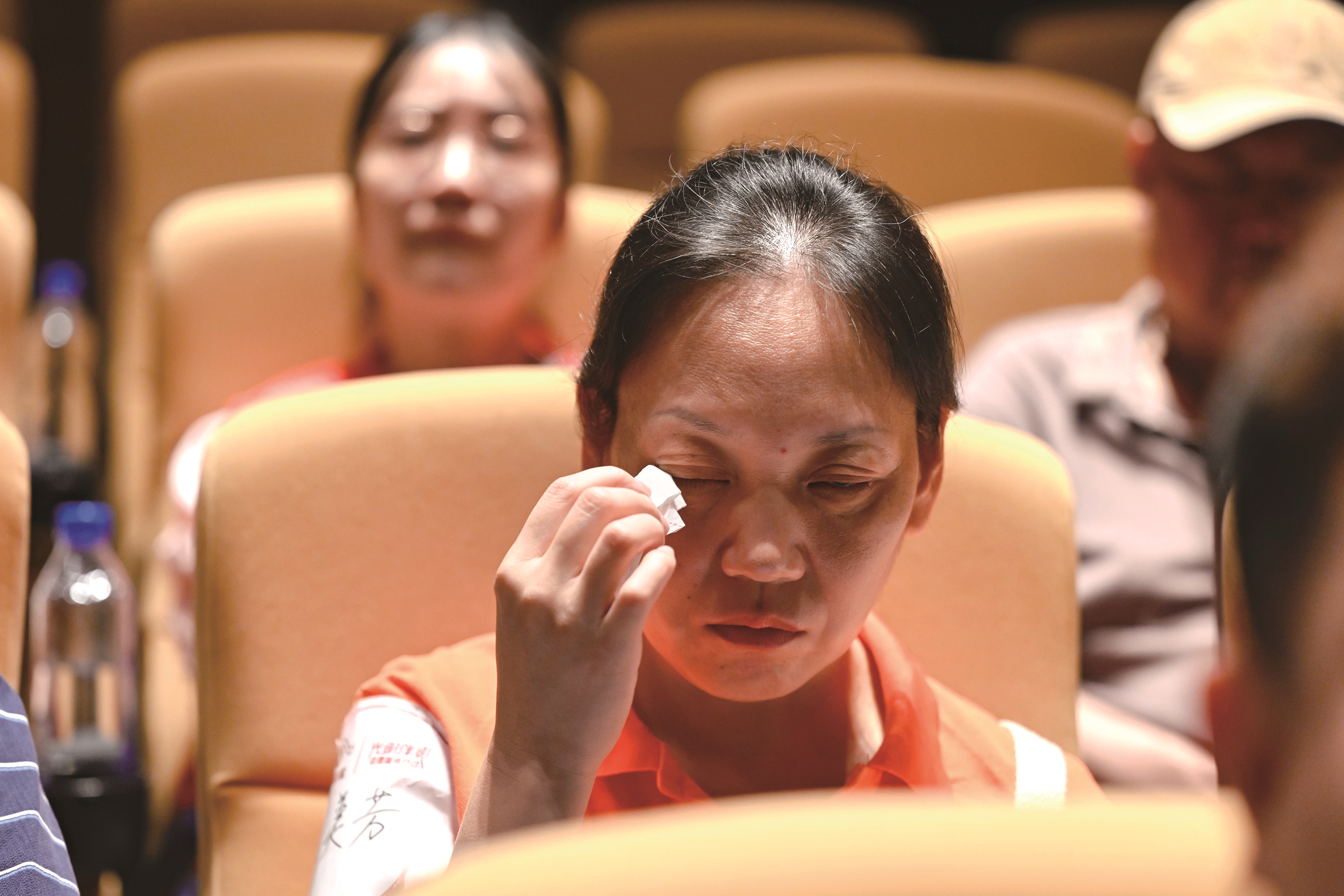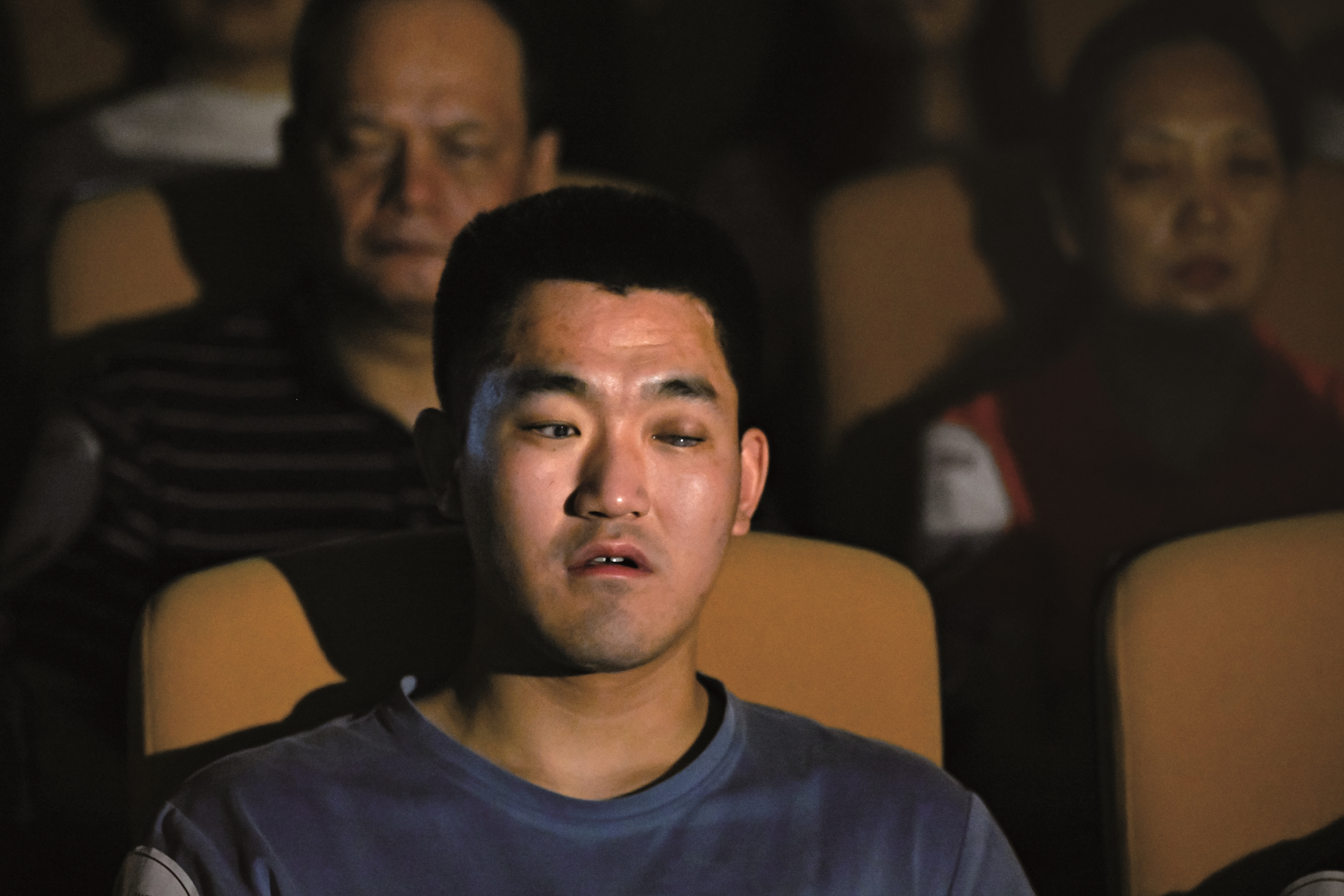 在“光明影院”无障碍观影活动现场,视力障碍人士在志愿者的帮助下落座,等待电影的开始。