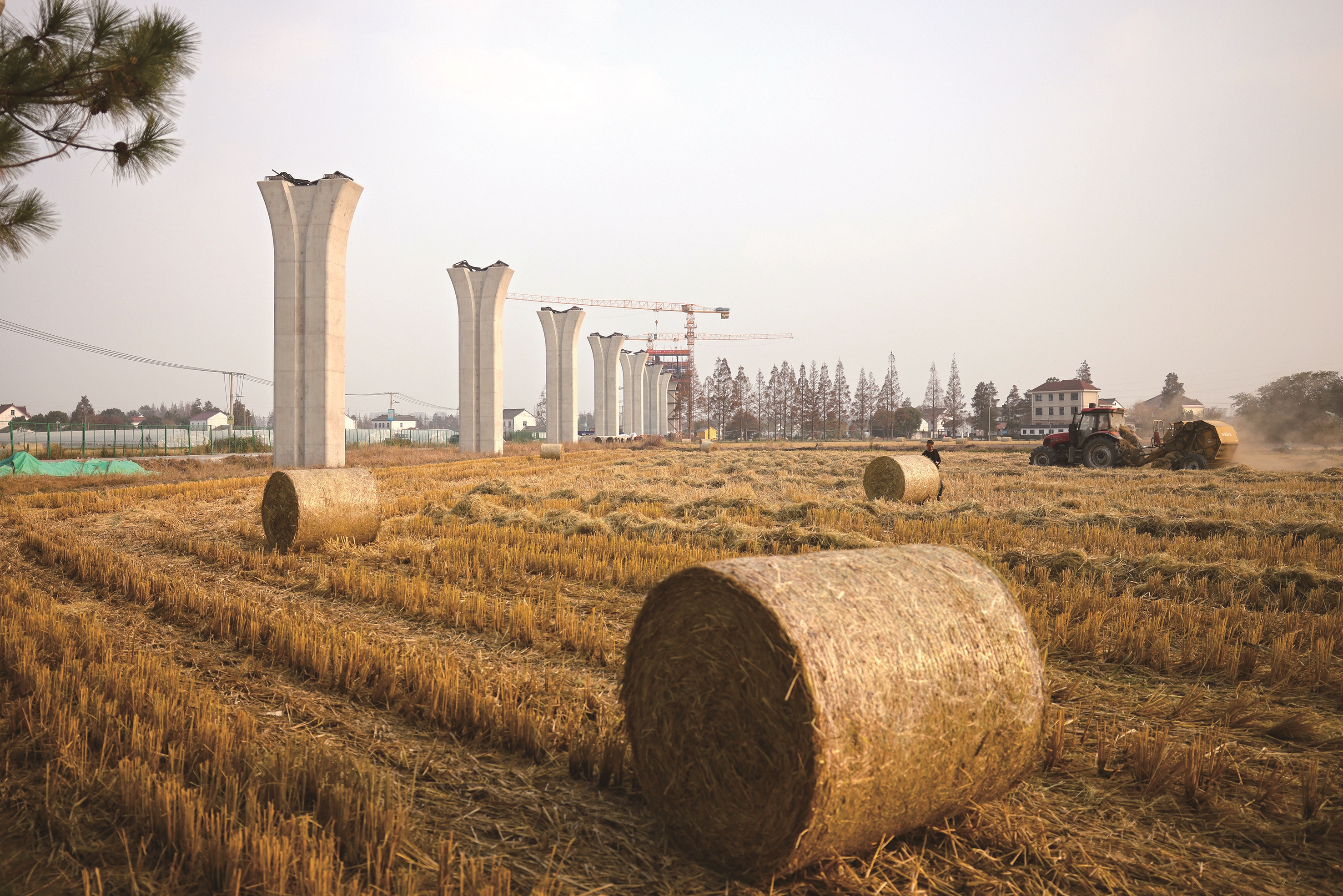 昨天,在嘉善县西塘镇,沪嘉城际铁路西塘线的高架桥墩如雨后春笋般拔地而起,桥墩旁机械化打包的秸秆捆错落有致地横卧着,钢铁长龙与丰收图景在此同框,奏响了“建设”与“丰收”的协奏曲。
