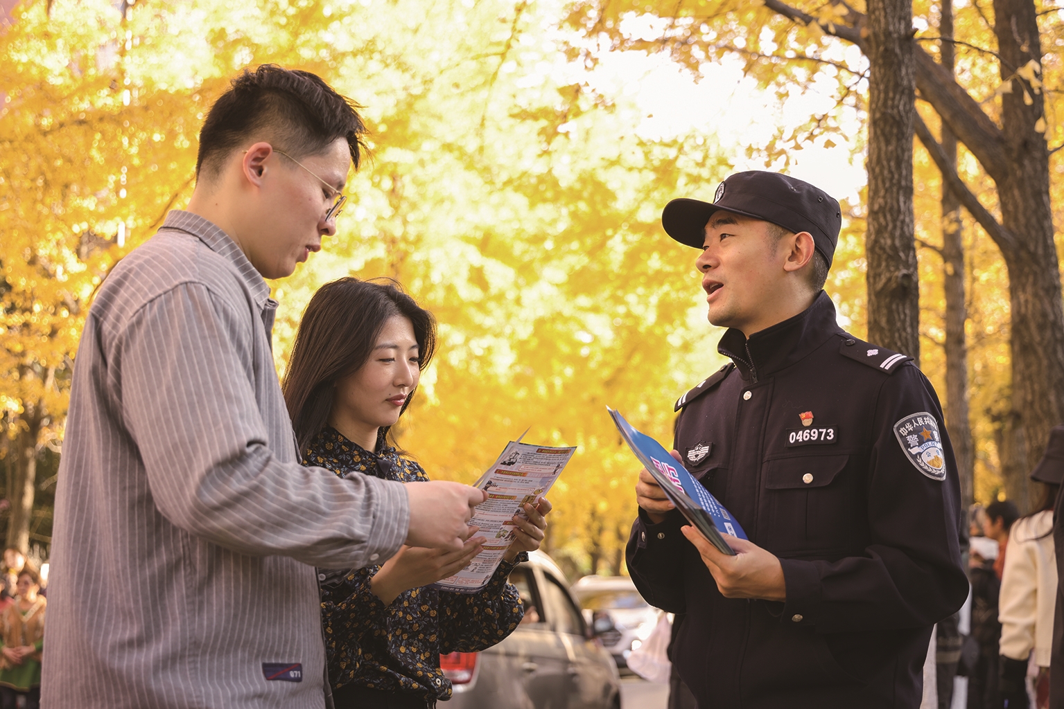 11 月 30 日下午,嘉兴 “网红路” 三塔路两侧银杏染黄枝头,吸引众多市民打卡。南湖区公安分局新兴派出所组织民警、辅警向市民们发放反诈宣传单页,详解近期高发电信网络诈骗案例及防范要点,筑牢反诈防线,让安全意识随杏叶飞扬浸润千家万户。