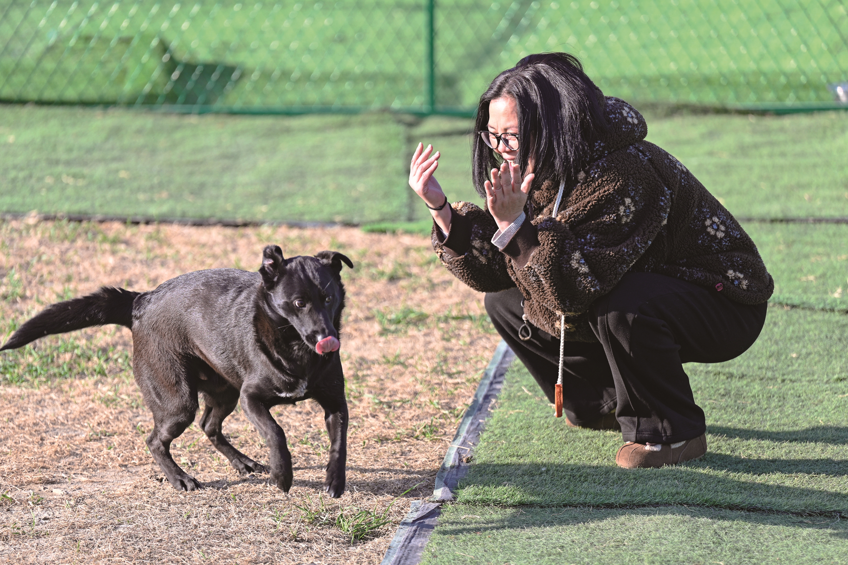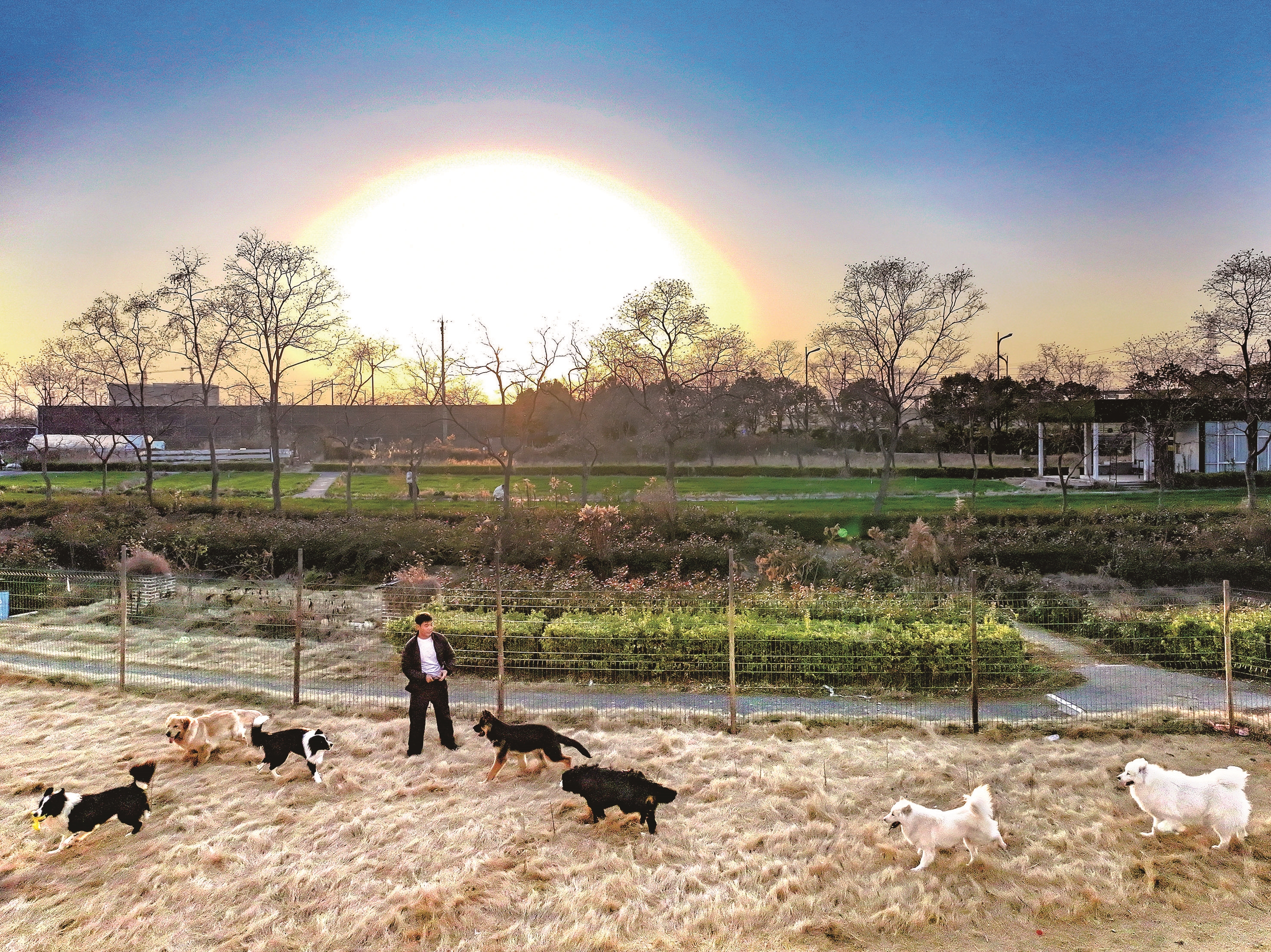 除了规律的饮食,每日三次的院落集体活动,成为宠物狗们释放活力、互动社交的重要环节。店外,三亩地的遛狗场被一人高的护栏加固围起,为入住的“毛孩子”们提供了充足的活动空间,宠物狗们或结伴奔跑嬉戏,或安静休憩玩耍,活泼的身影与乡村的自然环境相映成趣。