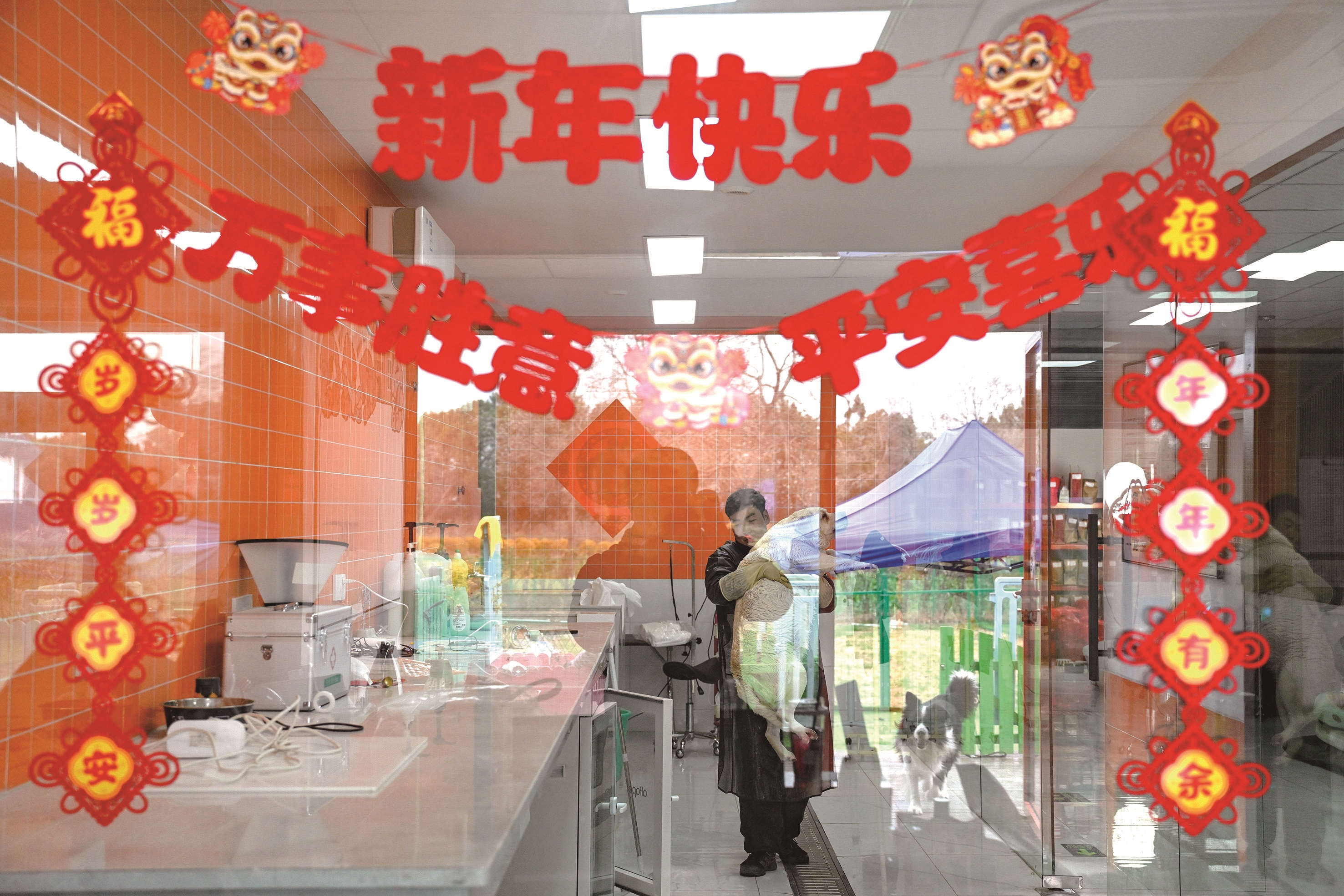 新春佳节,店内处处洋溢着喜庆祥和的氛围,主理人张松正在给“毛孩子”洗澡。