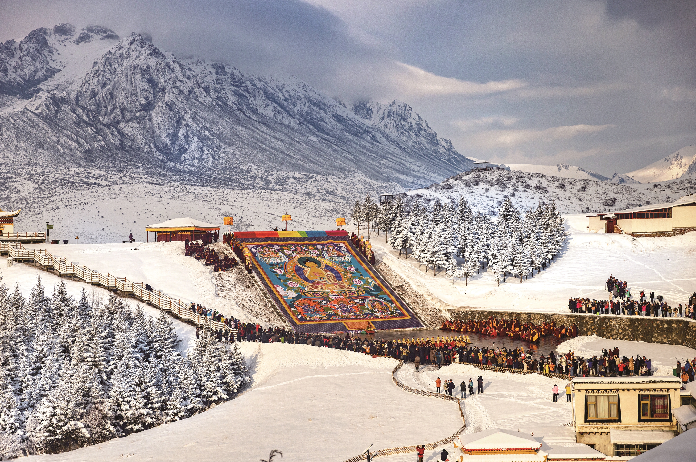 点评:这是一张兼具人文厚重感与自然震撼力的纪实风光佳作,完美记录了“晒大佛”这一民俗盛事。采用高视角俯拍,将巨型唐卡、朝圣人群、藏式建筑与雪山林海完整纳入画面。其中唐卡的浓艳色彩与纯净的白雪形成强烈对比,既构成吸睛的视觉焦点,又展现了雪域高原非遗民俗活动的壮观和圣洁。