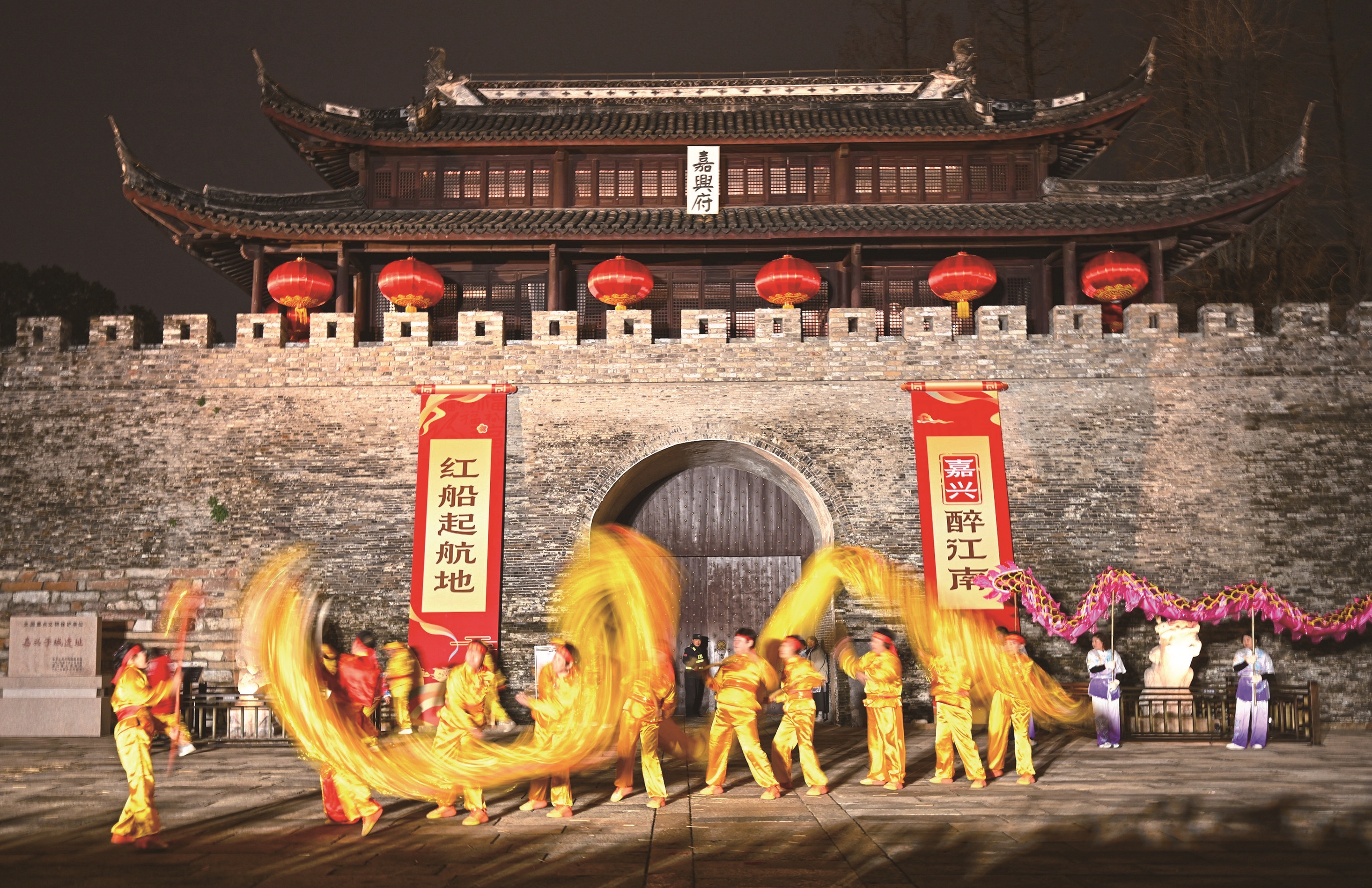 点评:通过长曝光拍摄,将舞龙表演呈现出金色龙身的流动光轨,与背景沉稳古朴的嘉兴府城楼形成强烈的动静对比,既展现了民俗表演的热烈动感,又凸显了古建筑的庄严厚重。