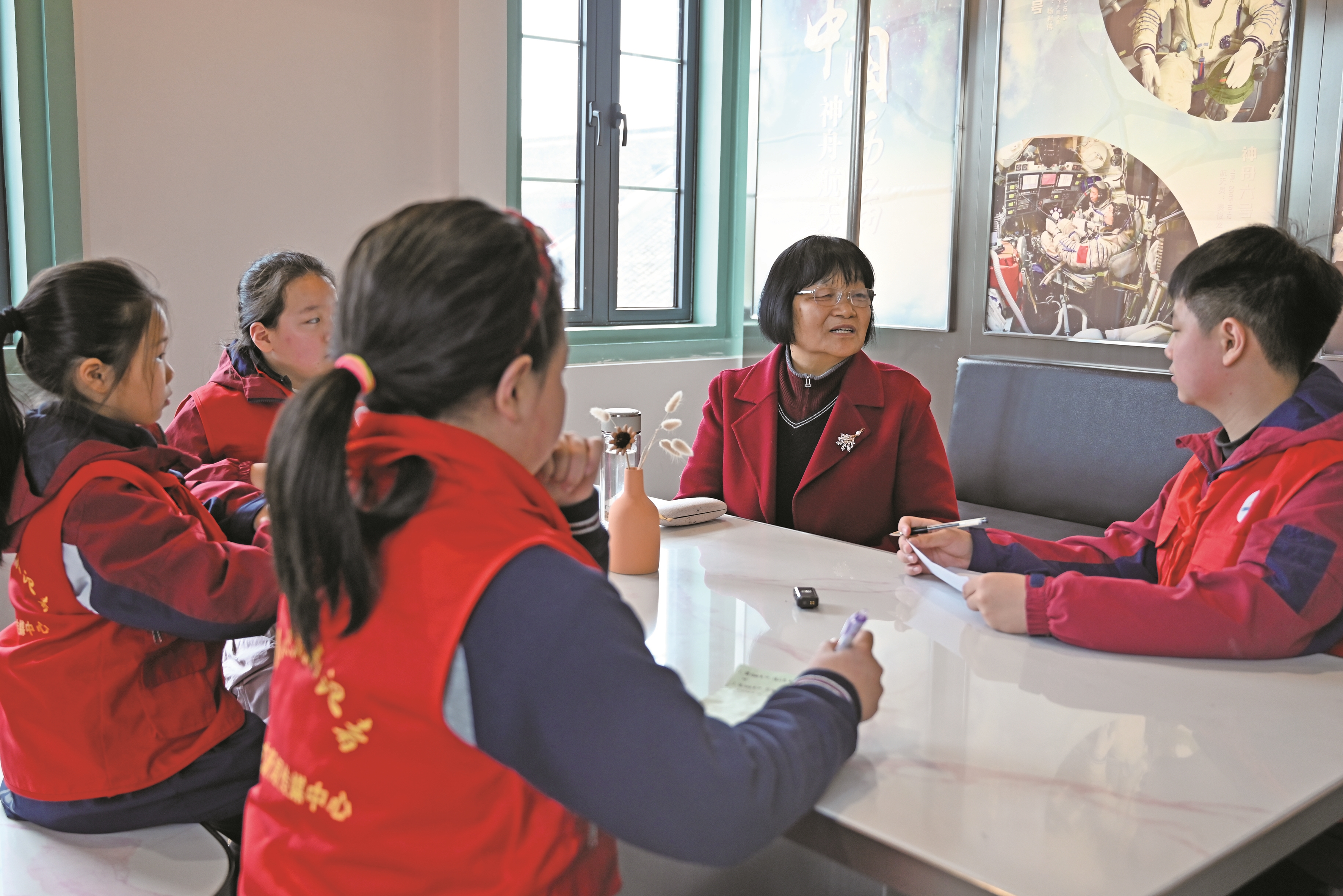 3月11日,馆内迎来了一群访客——平湖市黄姑实验学校的4名南湖晚报小记者白书瑜、付玉婉、张书萌、白泽源。他们此行的目的,是寻找一位在当地家喻户晓的“传奇人物”,全国关心下一代“最美五老”、平湖市关工委“薪火讲师团”讲师团成员姚爱英老师。从一名普通的乡村女教师,到首个建在乡村的“国字号”航天科普馆的筹建者,姚爱英用30多年的时光,在孩子们心中种下了“仰望星空”的种子,被誉为“中国民间航天教育第一人”。小记者们围坐在姚老师身边,聆听她用一口亲切的乡音,讲述那段跨越了30多年的“追星”故事,共话家风与国风。