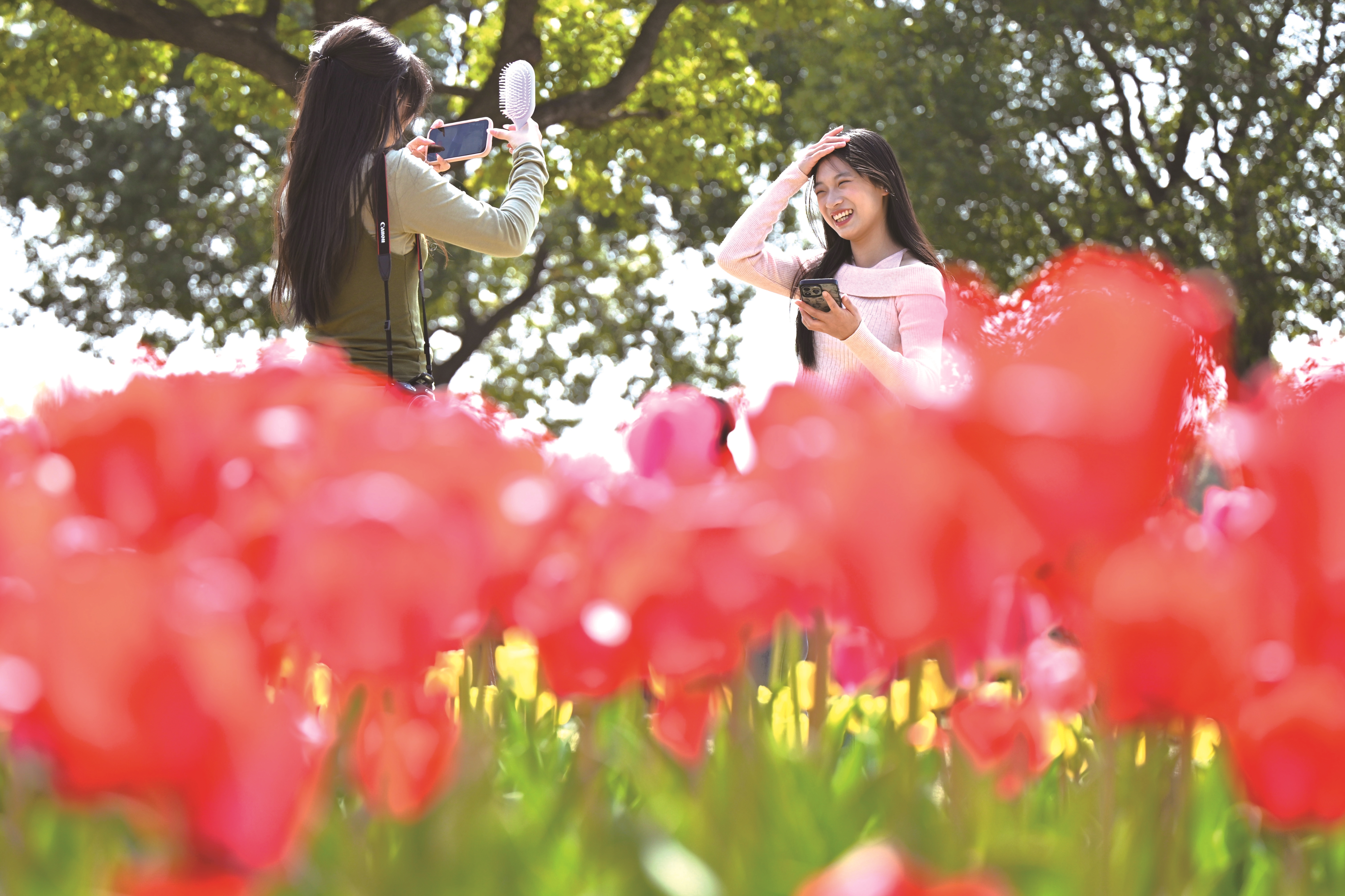 随着气温回升,在嘉兴经开区姚家荡公园,放眼望去,成片郁金香花海在阳光下铺展,交织成一幅绚丽的春日画卷。市民们穿梭于花径之间,或举起手机定格美景,或俯身细嗅芬芳,在斑斓花海中尽享惬意时光。