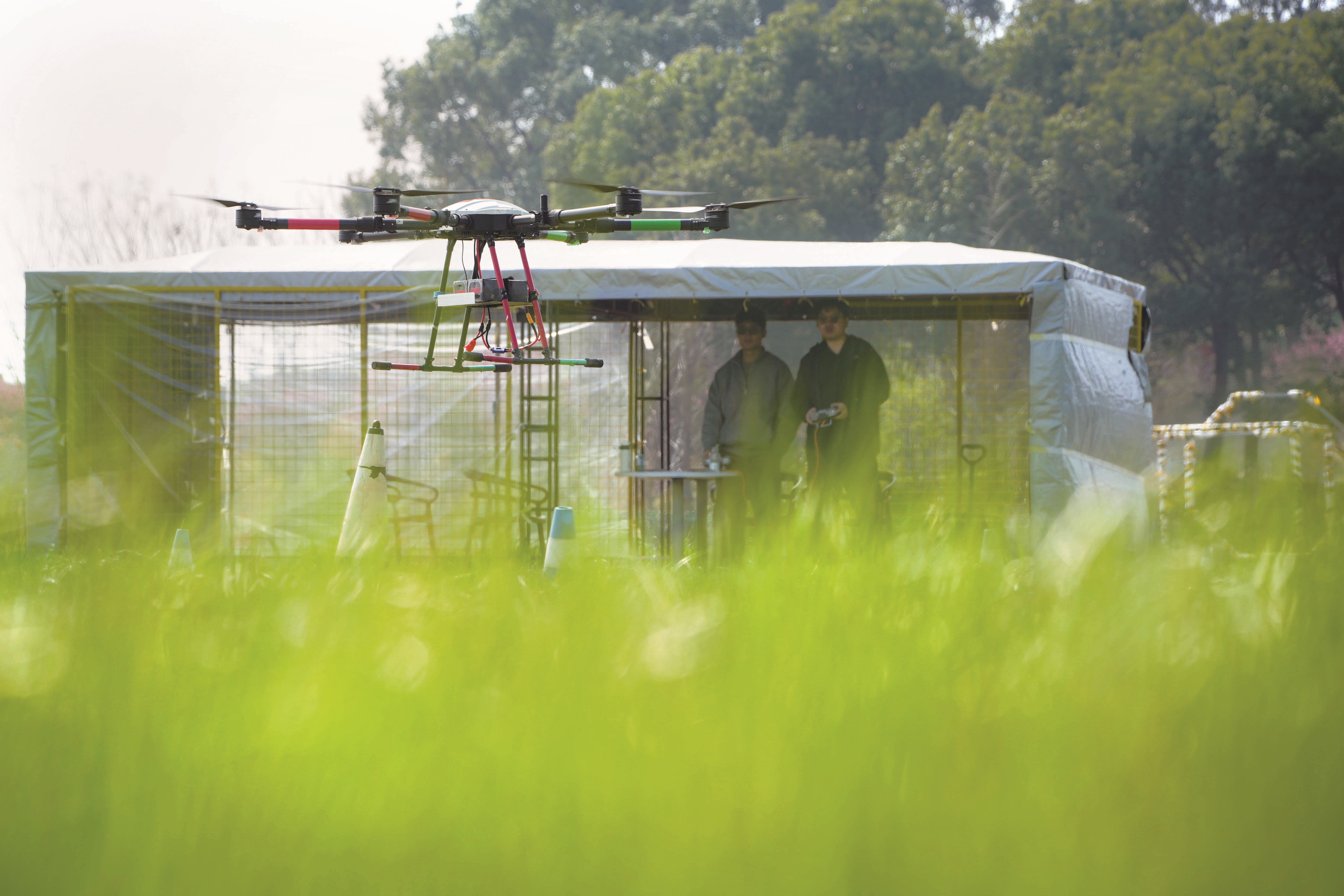 3月13日,在凤桥镇永红村天旭航空基地内,学员在教练指导下练习无人机操控技术,备考航空证书。现场,学员手持遥控器,专注练习起飞、悬停、绕飞等动作。
