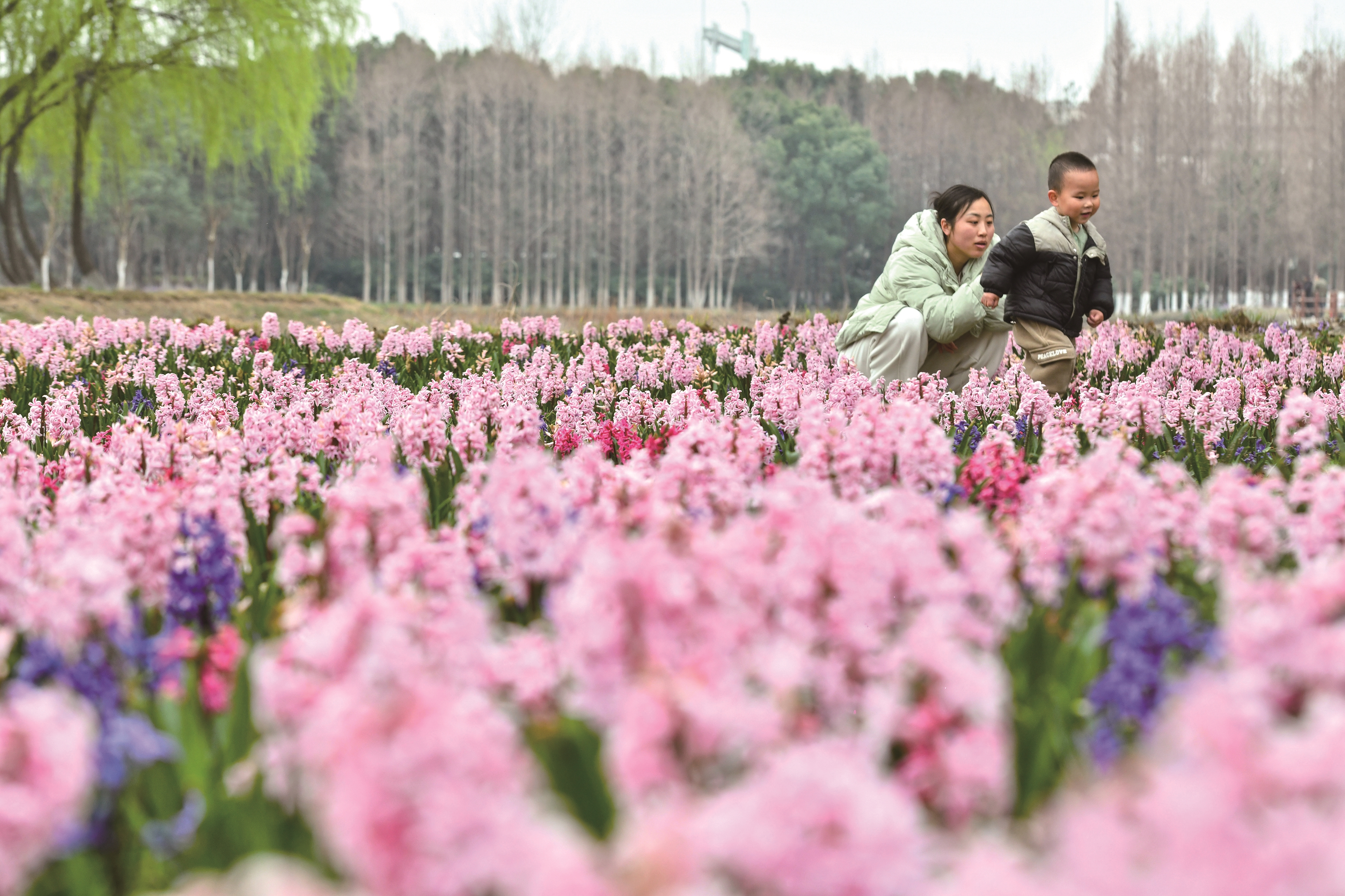 3月15日,嘉兴市穆湖森林公园内,郁金香、风信子、二月兰、早樱等各色花卉竞相盛放。正值踏青的好时节,公园内游人如织,共赏春色。