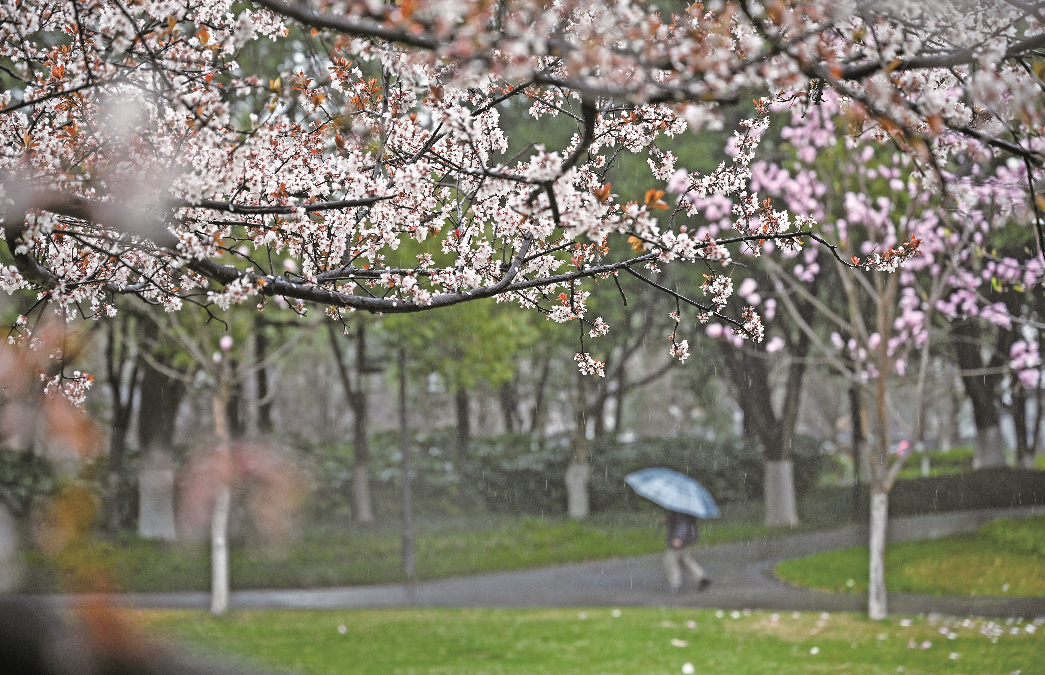 昨天午后,嘉兴市区细雨霏霏,范蠡湖公园内别有一番景致,市民们撑伞漫步,在朦胧烟雨中观赏早春景色。