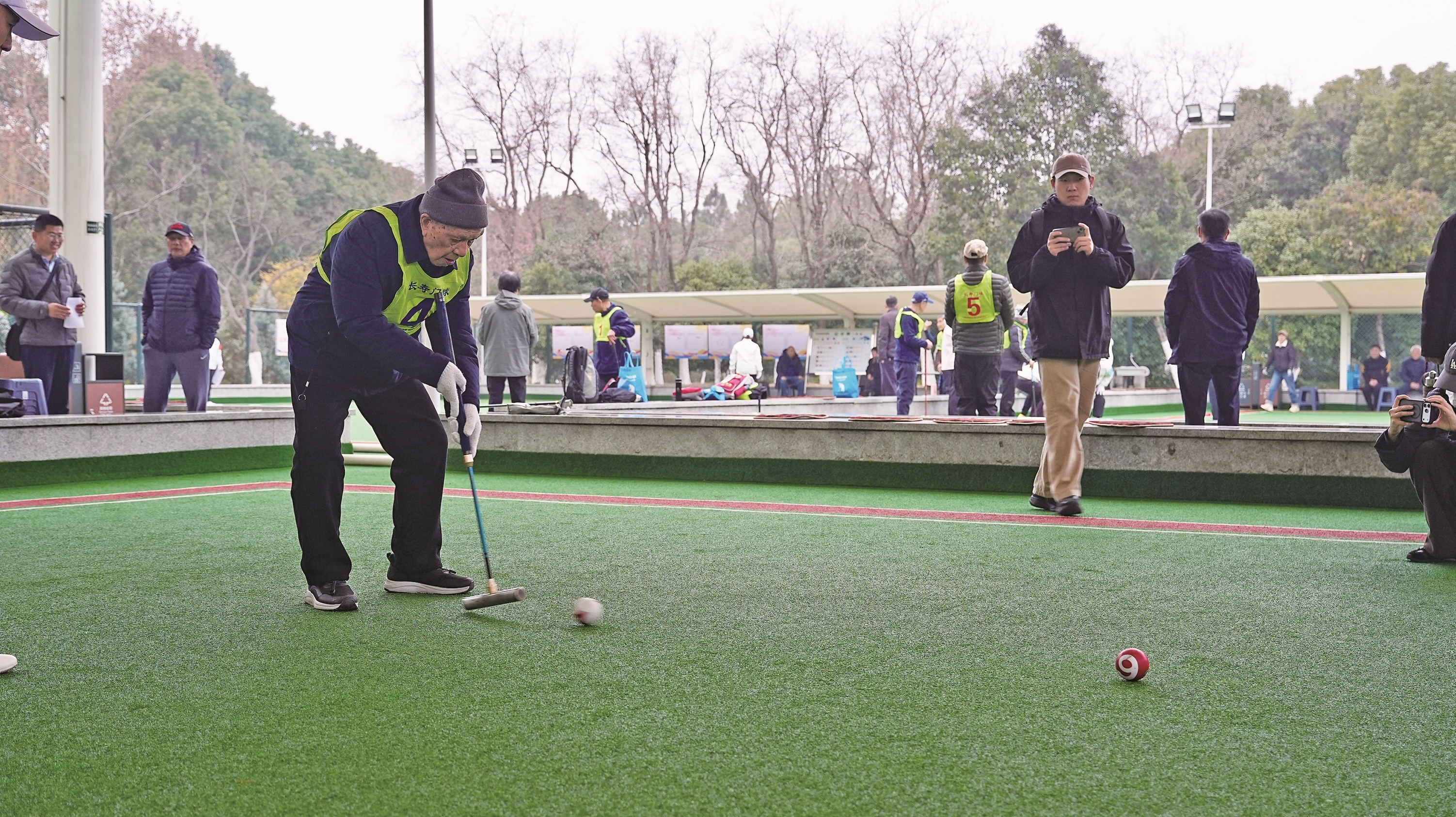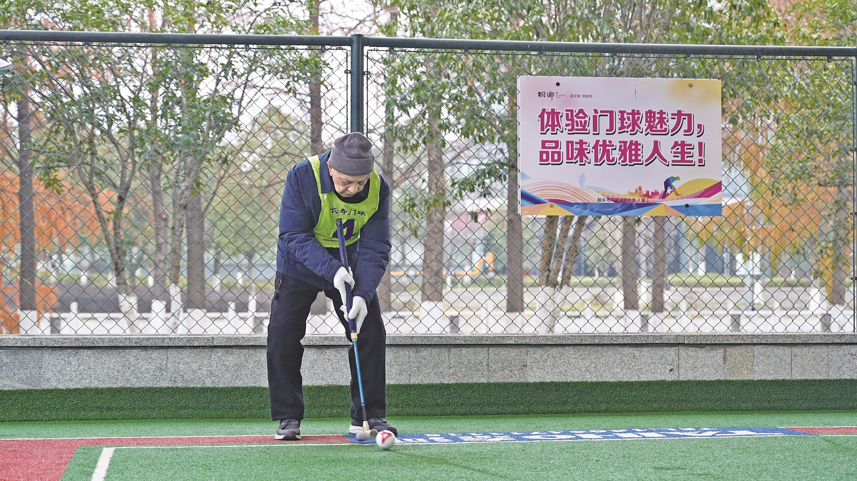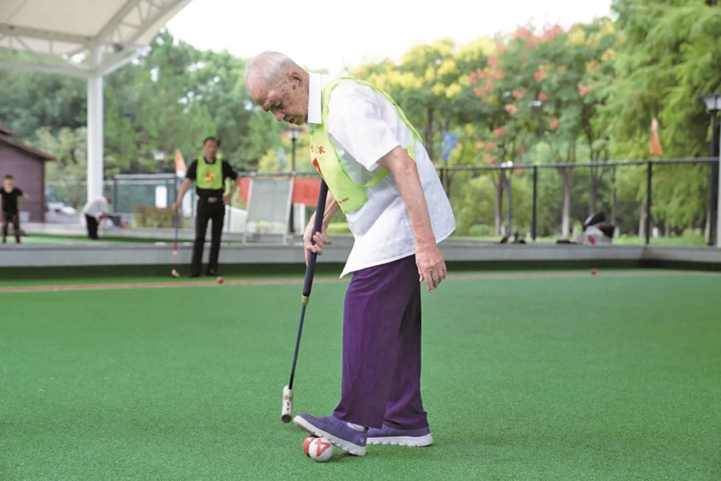 他头戴灰色毛线帽,身穿运动外套,俯身、架杆、瞄准、击球——动作一气呵成。“啪”一声脆响,红色小球精准穿过球门,若不是那满头的银发在晨光中熠熠生辉,很难让人相信,这位挥杆自如的老者已是103岁高龄。