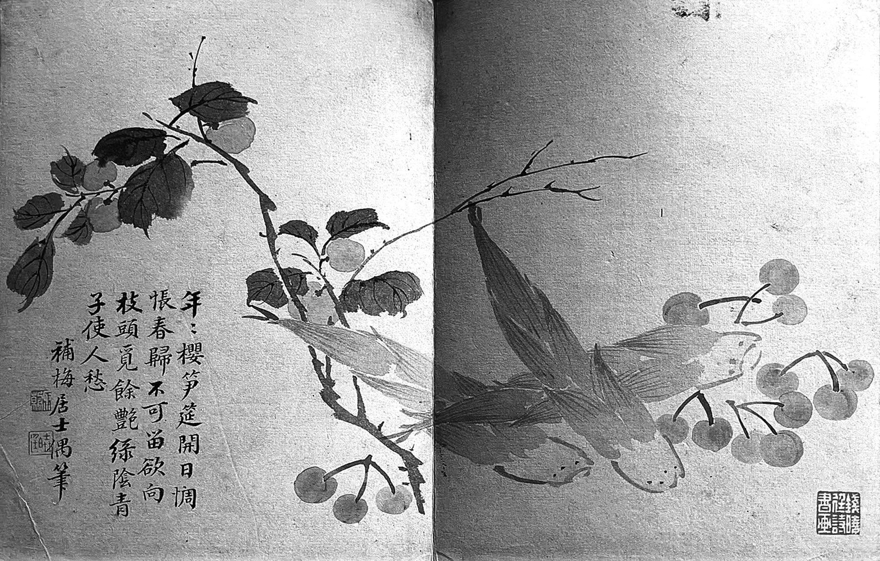 钱聚朝擅画也能诗,所以每画即配诗。册页中的《西瓜槜李图》诗云:“铜瓶晓汲井华香,快嚼应怜沁齿凉。乞与相如疗渴病,何须玉碗酌琼浆。净相寺今存几树,筠篮摘赠重玙璠。鸱夷去后无消息,頳颊犹留一掐痕。”说的是用井水浸过的西瓜清凉可口,能治疗消渴;净相寺的槜李似光泽温润的美玉,上面还留着西施的掐痕。《樱桃春笋图》诗云:“年年樱笋筵开日,惆怅春归不可留。欲向枝头觅余艳,绿阴青子使人愁。”感慨的是青梅成熟时,人们享受着樱桃和春笋的美味,可惜春天留不住,年华不复回。《豆荚菜花图》诗云:“落红如雨点烟莎,挑菜归来湿凤鞋。如是浴蚕天气近,桑荫豆荚晓犹多。”意思是桃花已谢,桑树成荫,蚕豆成熟,踏春挖野菜归来的女子湿透了绣花鞋,农忙的时节也到了。《荔枝葡萄图》虽没有配诗,但用文字说出了自己的感受:来自西域的马乳葡萄为北方水果中的优品,只有福建的荔枝略可与之匹配。
