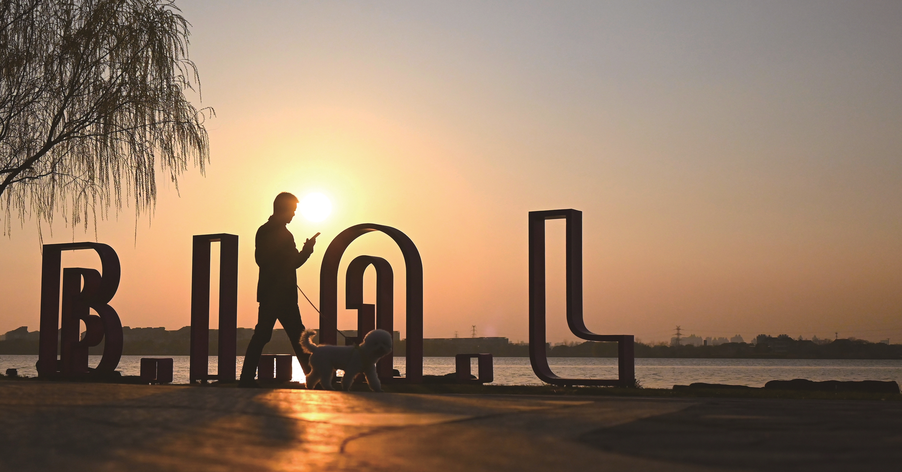 点评:夕阳逆光营造出温暖柔和的金色剪影,人物、小狗与字母装置的轮廓清晰有力,水面反光和地面光影层次丰富。画中人遛狗、看手机的日常细节,被夕阳赋予了温暖与诗意,把平凡的遛狗瞬间拍出了治愈感,传递出都市人慢下来的松弛感,富有感染力。