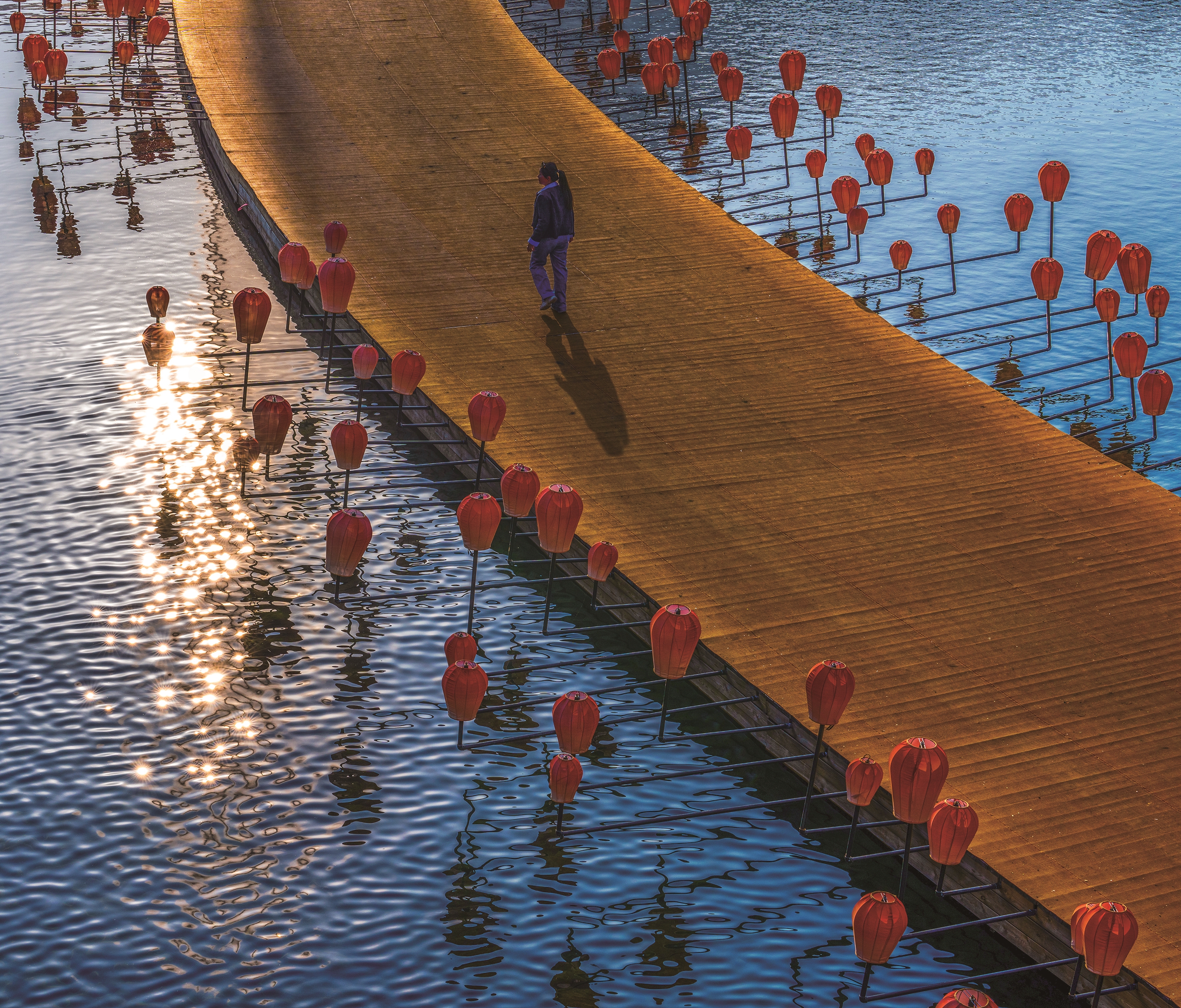 点评:水面反射的阳光形成了金色的光斑,如同碎金洒落,为画面增添了灵动的诗意。金色的栈道与暖红色的灯笼构成了画面主基调,与冷色调的深邃水面形成鲜明对比,既衬托了光影的明亮,又稳住了画面的色彩平衡。金色的栈道形成了极具张力的透视线条,完美引导观众的视线汇聚于行走的人物身上。