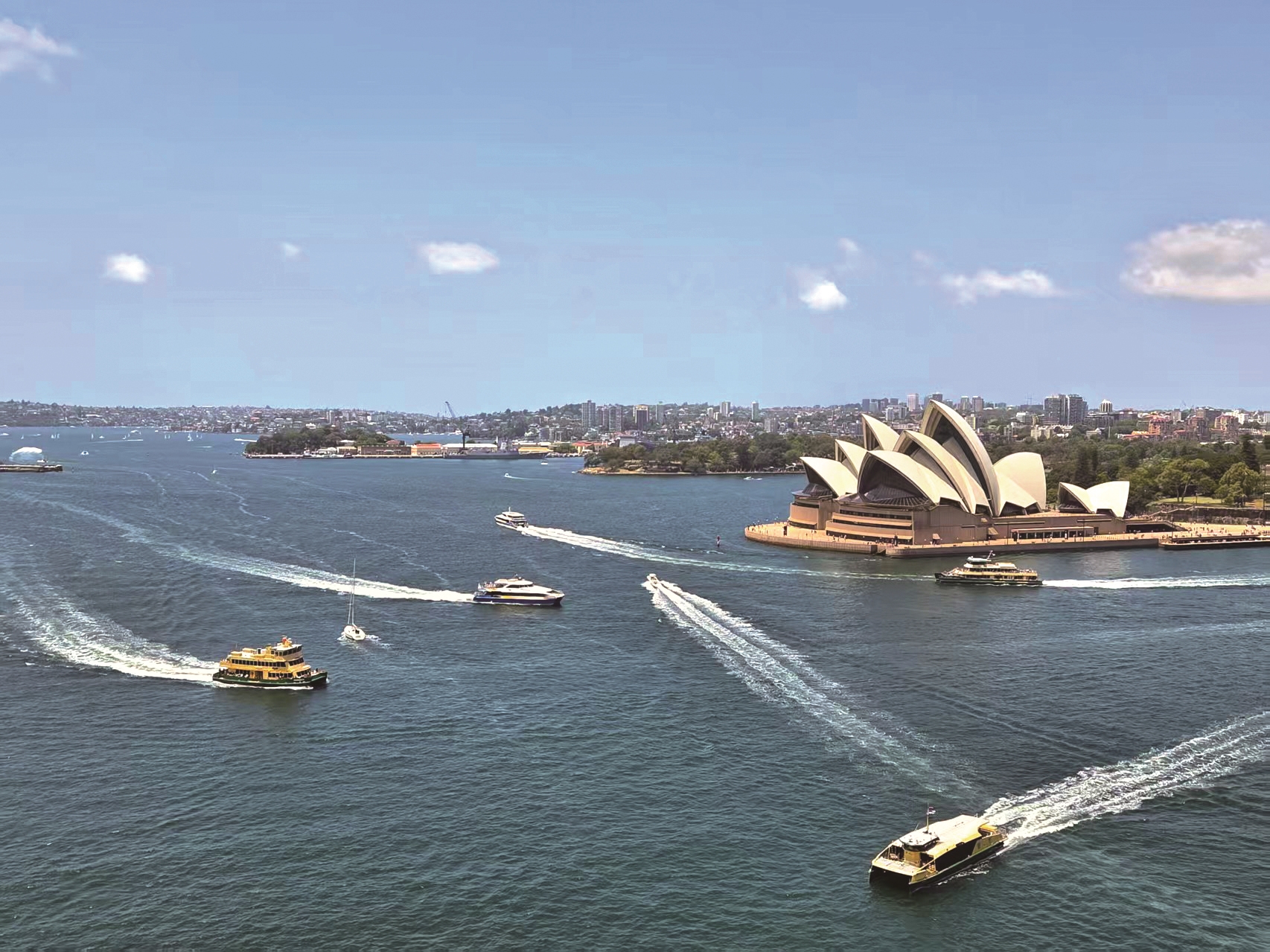 点评:悉尼歌剧院的贝壳状屋顶占据视觉核心,在晴朗蓝天的映衬下极具地域标志性,一眼即可辨识。多艘船只错落有致分布,由近及远延伸,引导视线从前景渡轮自然过渡到歌剧院与远处的城市天际线,画面层次丰富。
