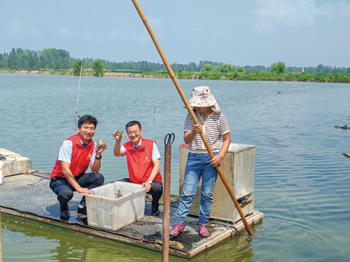 山东微山农商银行工作人员到大闸蟹养殖基地了解蟹农生产经营及资金使用情况 山东微山农商银行供图