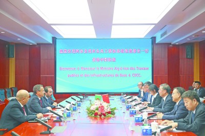 图为7月19日,中国铁建总裁、党委副书记庄尚标与阿尔及利亚公共工程和基础设施部部长拉赫达尔·洛克鲁克会谈现场。石亚强 摄 | 本报北京7月21日讯(记者邹 静 通讯员石亚强)7月19日,中国铁建总裁、党委副书记庄尚标在中国铁建大厦会见阿尔及利亚公共工程和基础设施部部长拉赫达尔·洛克鲁克一行,双方就进一步深化阿尔及利亚公共基础设施建设等方面合作进行深入交流。
