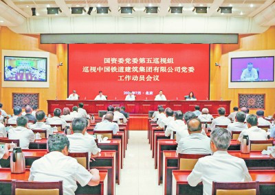 图为国资委党委第五巡视组巡视中国铁道建筑集团有限公司党委工作动员会议现场。冯仕杰 摄 | 本报北京7月26日讯(记者王 莹)根据国资委党委关于巡视工作统一部署,近日,国资委党委第五巡视组巡视中国铁道建筑集团有限公司党委工作动员会召开。会前,国资委党委第五巡视组组长吴龙胜与中国铁建党委书记、董事长汪建平,党委副书记、总裁庄尚标见面沟通,通报了巡视工作有关安排。会上,吴龙胜作动员讲话,通报本轮巡视的任务安排、监督重点和有关要求。汪建平主持会议并讲话。