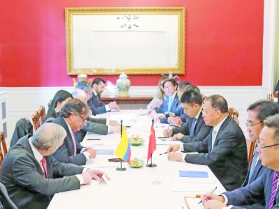图为10月25日,中国铁建党委书记、董事长汪建平与哥伦比亚总统佩特罗会谈现场。郭潘峰 摄 | 本报北京10月26日讯(记者张 晶 通讯员杨 璇)10月25日,中国铁建党委书记、董事长汪建平在京拜会来华进行国事访问的哥伦比亚总统佩特罗,双方围绕哥伦比亚交通建设合作进行深入交流探讨,并达成共识。
