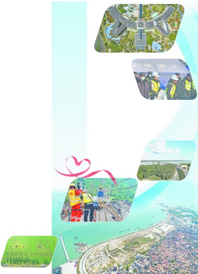 中铁建设负责改造的首个国家级零碳示范区—博鳌零碳示范区建筑绿色化改造项目。 郑航程 摄 中铁二十一局在积石山地震发生后,协助搭建应急救援帐篷。 李 昕 摄 中铁十七局援孟加拉国孟中友谊八桥工程。 郭红彬 摄 中铁建电气化局员工在铁路抢险现场作业。潘瑞强 摄 中铁二十二局三公司承建的中国铁建首个海洋生态修复项目—福建泉州泉港海洋生态修复工程。 侯钦佩 摄 中铁二十三局安徽阜南县田集镇乡村振兴项目。马鹏飞 摄 | 通讯员 林 凤