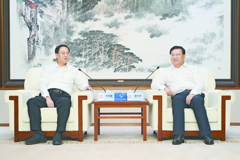 图为10月9日,戴和根与潮州市委书记、市人大常委会主任何晓军会谈现场。肖永顺 摄 | 本报北京10月10日讯(记者张 晶)10月9日,中国铁建党委书记、董事长戴和根在中国铁建大厦与到访的潮州市委书记、市人大常委会主任何晓军举行会谈,双方就进一步深化央地各领域务实合作进行交流,并达成共识。