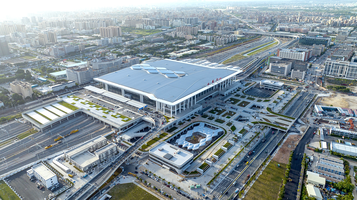 2024年9月,新建汕头站正式开通运营。该站是我国粤东地区规模最大、交通接驳功能最齐全的综合高铁枢纽。中铁建设创新应用全国首例建构一体化树状造型钢结构柱施工技术、全国首例异形多曲变截面连续拱形全现浇清水混凝土雨棚等多项绿色低碳技术。图为新建汕头站。 杨富岗 摄 |  |