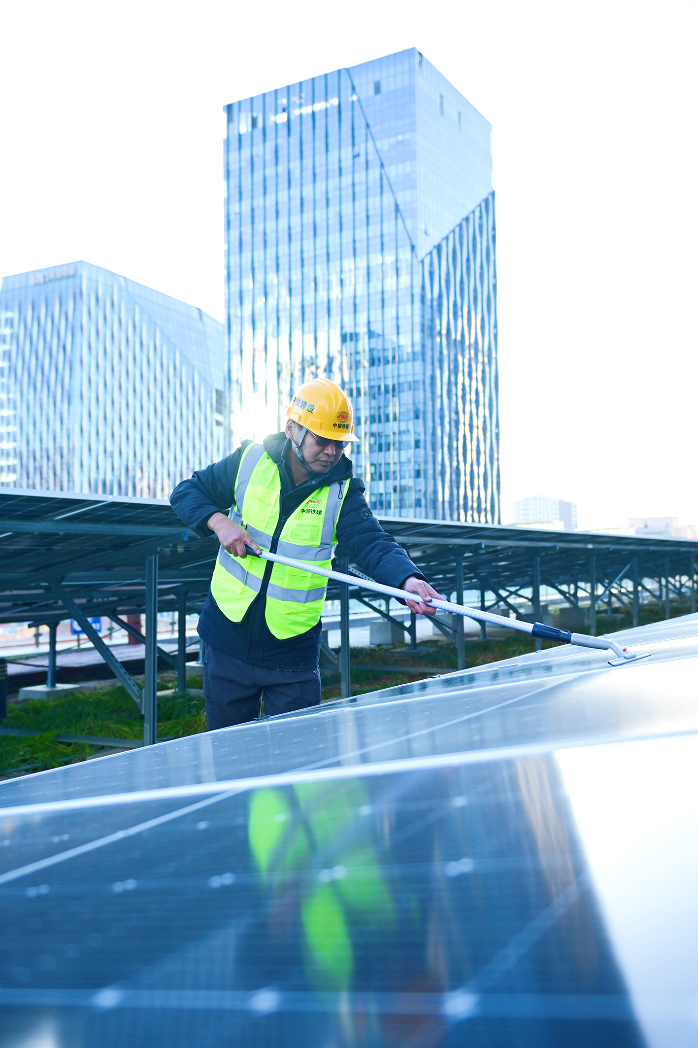 中铁建设应用“4+1”节能降碳技术体系完成中铁建设大厦的绿色低碳节能改造,通过在大厦裙楼及顶层安装273块光伏板,最大限度利用可再生能源。据悉,光伏板冬季日均发电量达312千瓦时,产生的绿电可满足大厦6%的用电需求。图为运保人员清洁光伏板。 袁 鹏 摄 |  |