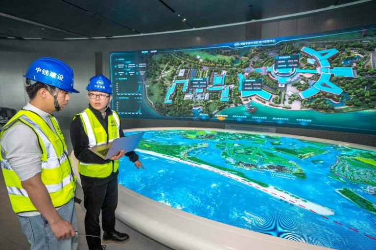 博鳌近零碳示范区运行管理中心可以对整个零碳示范区进行碳监测、碳核算及智慧化运维。中心搭载了智慧能源管控平台,该平台运用“CIM+BIM”建设3D数字孪生东屿岛模型,接入楼宇管控、灯光照明、环境监测等系统,实现可视化监测管控,定期反馈设备运行状态,根据建筑空间人数及室外光照强度,动态调节空调及灯光。图为博鳌近零碳示范区运行管理中心。 王佳琦 摄 |  |