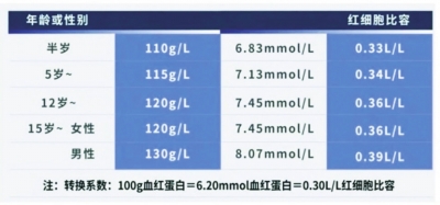 关于缺铁性贫血,有一套年龄别血红蛋白正常值指标,我们可以按照这个表格来看下自己的体检报告,看看自己有没有贫血。