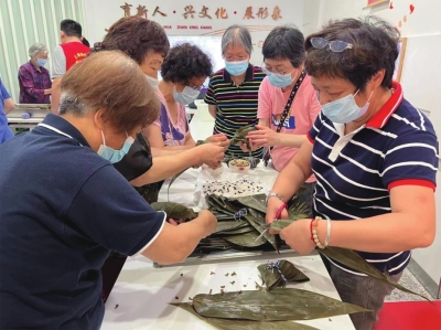 包粽子、画蒲扇、佩香囊……端午佳节,虹口社区开展一系列活动。图为凉城社区举办的包粽子、画蒲扇活动,营造节日喜庆氛围。