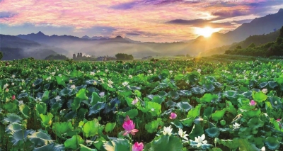 在群山环绕下,种在梯田里的千亩荷花依次盛开。山、水和花层层叠叠,宛如起伏的波浪,既有野趣,又十分壮观。
