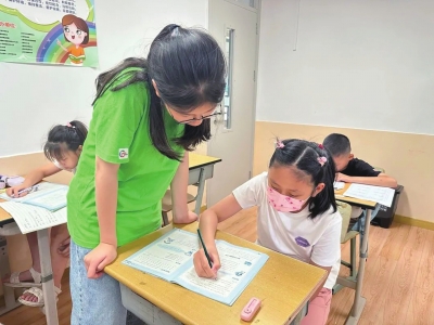 江湾镇街道爱心暑托班的办班点设在丰镇中学,早上九点,萌娃们已抵达教室,正在志愿者的指导下完成当天的暑假作业。