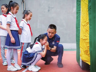 随后,同学们来到操场,消防车、模拟火灾逃生帐篷、消防缓降器……这些平时难得一见的消防“神器”吸引了孩子们的目光。