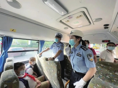 民警根据马路上发现的问题,不断向车内学生提问,学生们也观察着车内及道路上的情况,认真思考并回答民警的提问。