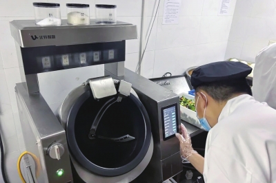 “现在我们有五十余种菜品可以用这款‘炒菜机器人’做出!”在食堂后厨,记者看到了全新亮相的智能炒菜机。这个一米八左右的“大家伙”外形像一个倾斜的滚筒,由控制台、炒菜桶、调味品区组成。工作人员只需备好食材原料,在控制面板打开需要制作的菜品,即可看到食材、调味料配比等信息,按提示投放即可。各种食材在电脑程序的控制下,自动旋转翻炒,平均一道菜3-4分钟就可以做好,大大提升了出餐效率。