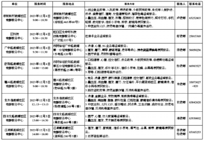 2023年“12·5国际志愿者日”为民服务活动安排表 注:1.届时欢迎广大党员群众踊跃参加。如活动时间、活动内容有变化,组织单位将在服务地点张贴变更公示,请及时关注。 2.曲阳路街道社区党群服务中心于12月1日上午9:00-10:30,在市民驿站曲阳路街道第二分站党群服务中心(辉河路51号1楼)举办活动。