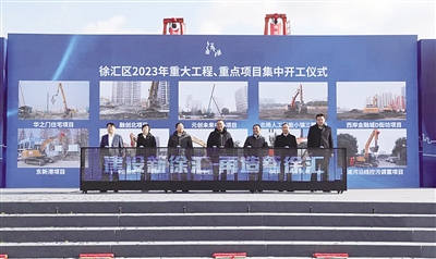 1月3日上午,徐汇区举行2023年重大工程、重点项目集中开工仪式。随着徐汇区西岸金融城工程现场的机器轰鸣声,徐汇区11个重大工程、重点项目现场同步举行集中开工活动,为到来的2023年奏响“奋进曲”。