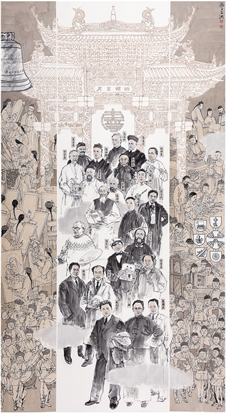 元旦这天,沪上知名人物画家奚文渊将一幅《土山湾》人物画作为迎新作品微信记者,只见竖构图三联画以“功昭日月”土山湾牌楼“压轴”作为骨架,形成强烈视觉冲击力,左侧上方“悬挂”印有土山湾Logo的古钟、好似敲响历史沉睡的记忆;中轴表现的是“土山湾”历史上的开创者、历任主持者以及从这里走出来的杰出画家。画家以他擅长的水墨人物画技法精心塑造了画馆创办人范廷佐(西班牙)、中外教师马义谷(意大利)、陆伯都、艾而梅(法国)、刘必振(字德斋)、范世熙(法国)、翁寿琪(法国)、安敬斋(爱尔兰)、葛承亮(德国)、马相伯;以及中国近现代著名美术家徐咏青、周湘、丁悚、杭穉英、张聿光、张光宇、雕塑家张充仁、木雕大师徐宝庆和任伯年、徐悲鸿、刘海粟、陈抱一等人物群像,以人叙史,向读者来展示土山湾画馆的百年历史。左侧铺陈的是梳着清朝辫子的土山湾学子钻研西洋画的艺术场景,还有吹吹打打鼓乐队等;右侧为土山湾孤儿学习照相制版、印刷、座钟制造、木雕和唱诗等活动。《土山湾》一画用线描和水墨两种技法塑造的人物形象约八十余人,其中有名有姓的真实人物就多达22人。无论从构图、线条、色彩明暗以及人物仪态举止等“精雕细刻”,堪称佳作,值得细品。