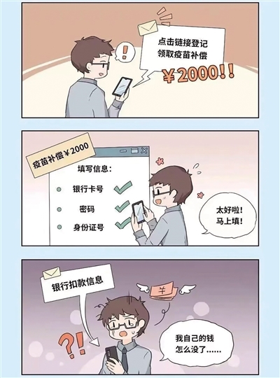 房先生收到一条短信息,称“凡是接种过疫苗人员,可点击链接录入个人信息登记备案,领取疫苗接种库补偿款,补偿额度是2000元”。房先生查询发现自己疫苗接种正是这种疫苗,于是点击短信链接并进入了看似正规的网站,并根据网站指引填写了银行卡号、密码、身份证号等信息。输入完成后,房先生开开心心地坐等补偿款到账,谁知等来的却是银行扣款信息,此时才知受骗上当。