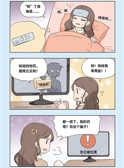 乔女士近日发烧嗓子疼,抗原检测后发现自己感染了新冠病毒。为缓解症状,乔女士便上网搜寻,看到有“售卖治疗新冠特效药,服用后15分钟内消除头痛及浑身酸痛症状”。于是病急乱投医的乔女士主动联系对方,并按照对方提示点入链接支付货款,然后等待快递。可一周过去,乔女士症状基本消退,药物还没送到,再联系对方却发现已被拉黑,此时乔女士才发现被骗。