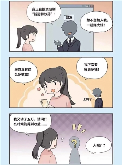 杨女士前些时间在某网络平台认识了一位网友,谈到当前疫情防控形势时,对方表示正在投资研制“新冠特效药”项目,预期收益很高,询问杨女士是否想参加。杨女士对此深信不疑,于是在对方的提示下给指定银行账户转账一万元,不久后对方告知药品已初步研制成功并获利2000元,并将收益转给杨女士。尝到甜头后,杨女士在对方诱导下又转账五万元。但此后,杨女士发现再也无法联系上对方,这才意识到被骗。