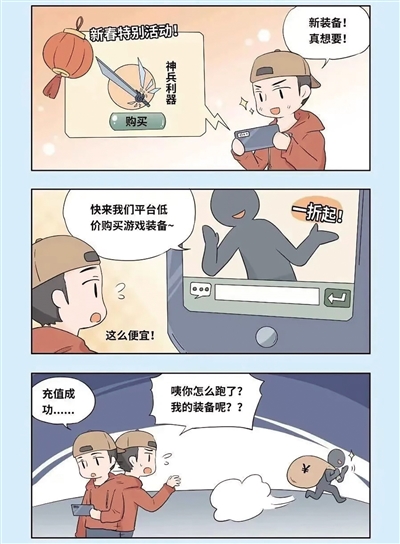 防范提醒:孩子放假在家,家长给孩子玩手机时,须谨防孩子被诱导支付购买虚假游戏账号装备,一旦发现被骗,请及时报警。