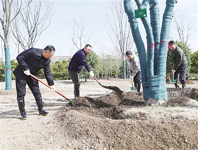 随后,大家一同为玉兰、榉树、朴树等近70棵高大乔木挥锹培土,为优化城区环境贡献力量,以实际行动履行了植绿爱绿护绿的公民义务。
